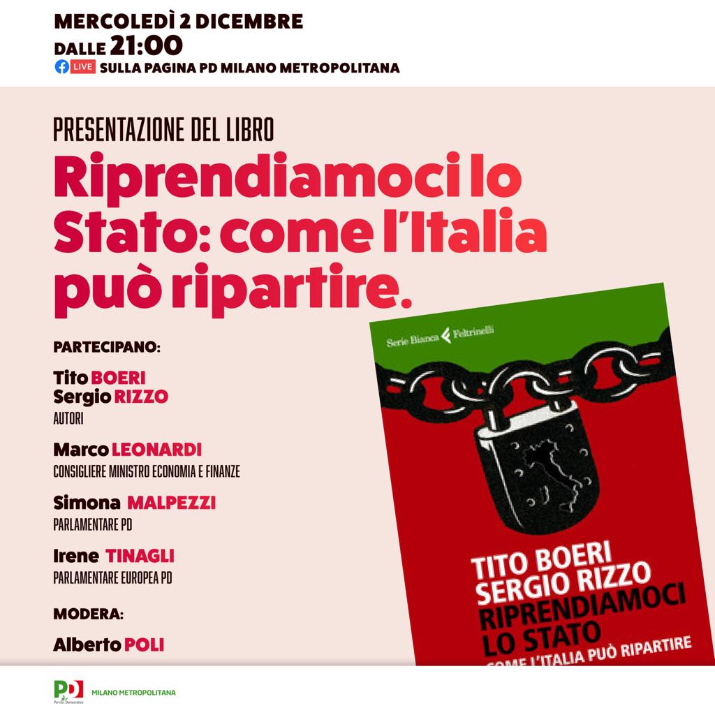 CON TITO BOERI, SERGIO RIZZO, IRENE TINAGLI, MARCO LEONARDI E SIMONA MALPEZZI, VI ASPETTIAMO MERCOLEDÍ 2 DICEMBRE, DALLE 21:00, IN DIRETTA FACEBOOK, per la Presentazione del libro RIPRENDIAMOCI LO STATO!L’evento è organizzato dal Gruppo Libri dei circoli Aniasi, Porta Romana ed EconDem, con la collaborazione della Federazione Metropolitana Milanese del PD. NON MANCATE!