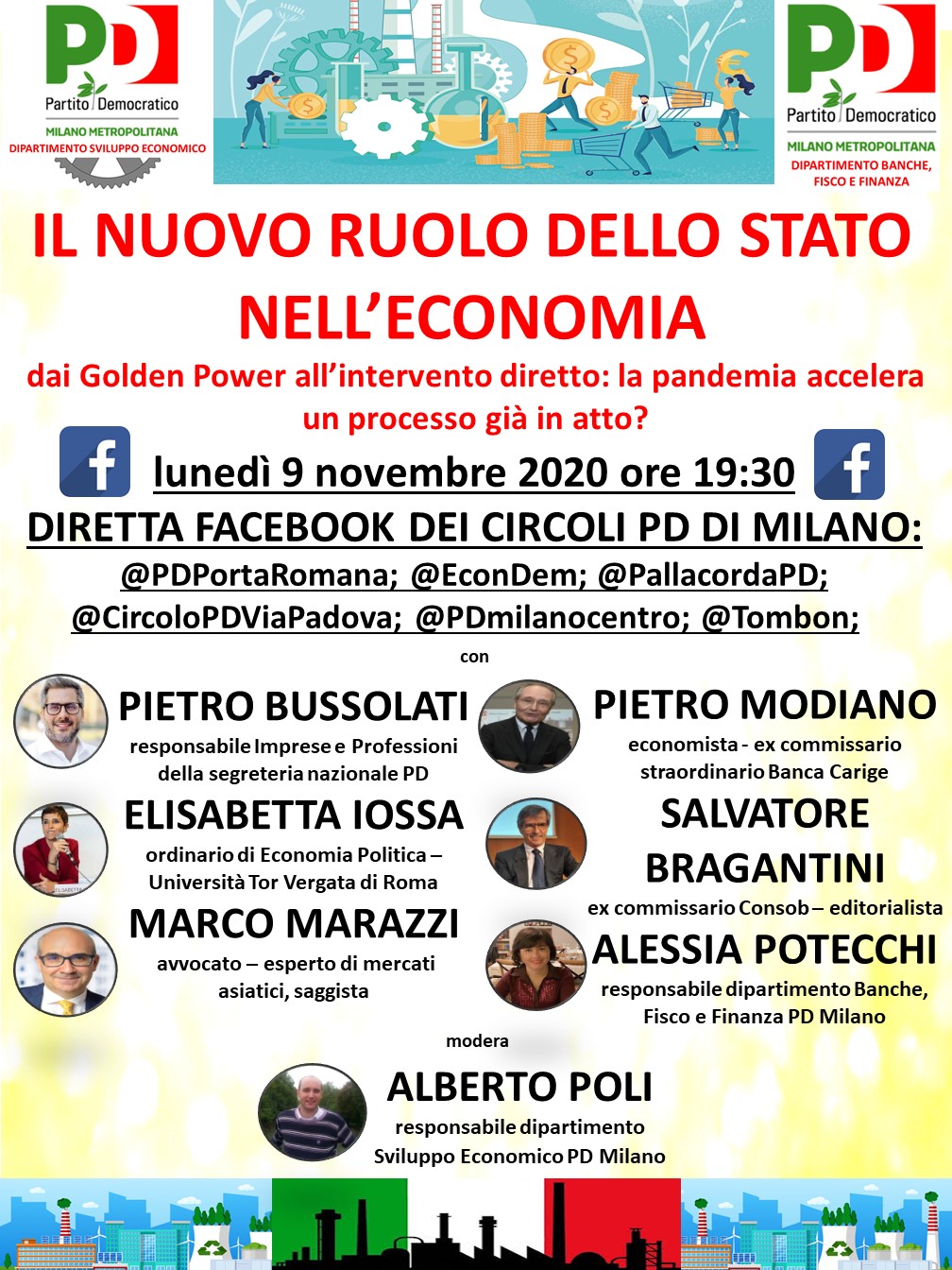 Lunedì 9 novembre dalle 19:30, in collaborazione con i dipartimenti del PD Metropolitano Milanese “Sviluppo Economico” e “Banche, Fisco e Finanza”, nonché con i Circoli PD: EconDem, via Padova , Aniasi e Pallacorda si terrà il dibattito, in diretta Facebook, dal titolo “IL NUOVO RUOLO DELLO STATO NELL’ECONOMIA”, con PIETRO BUSSOLATI, PIETRO MODIANO, SALVATORE BRAGANTINI, ELISABETTA IOSSA, MARCO MARAZZI E ALESSIA POTECCHI.